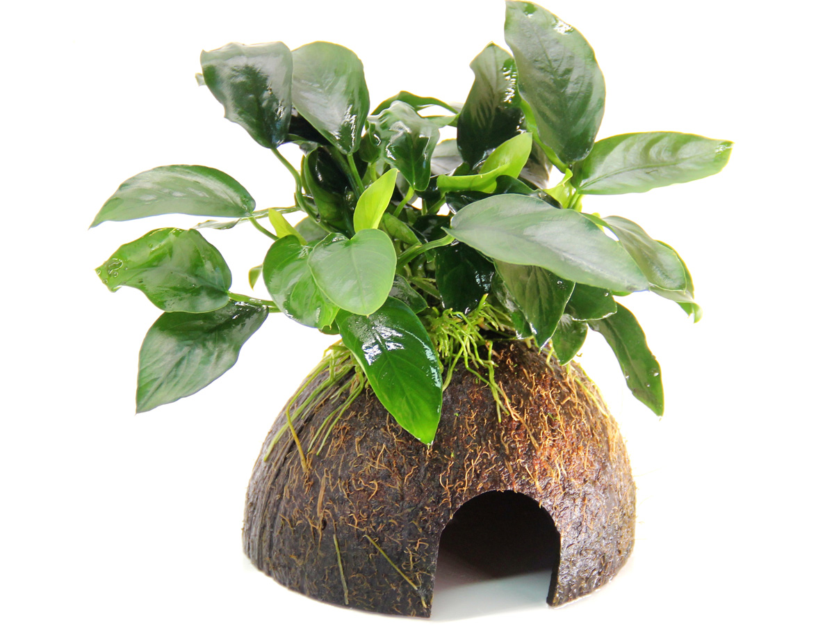 Die Lieferung umfasst die oben beschriebene Pflanze Anubias barteri var. nana, aufsitzend und fest fixiert auf einer sehr dekorativen hälftigen Kokosnussschale mit einem Durchmesser von ca. 14 cm. Die halbe Kokosnussschale verfügt mit einer kleinen Öffnung über einen Eingang ins Innere, so dass Aquarientiere, die eine Rückzugsmöglichkeit benötigen, sich darin auch mal verstecken können. Das Angebot einer Rückzugsmöglichkeit ist ein wichtiger Baustein zur artgerechten Tierhaltung ihrer Aquarientiere. Auch eignet sich die halbe Kokosnussschale mit Eingang optimal als Bruthöhle für Höhlenbrüter wie z.B. Antennenwelse oder Purpurprachtbarsche. Die bepflanzte Kokosnussschale können sie nach Belieben an einem Ort ihrer Wahl im Aquarium platzieren und umsetzen.
